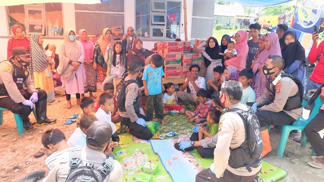 Wakasatgas Trauma Healing Polda Sulsel Kompol Fantry Taherong SH Sik MH, menambahkan, kegiatan yang dilaksanakan dari pagi hingga sore hari itu, diawali dengan pemberian bantuan logistik ke pemukiman warga.